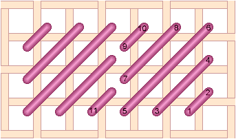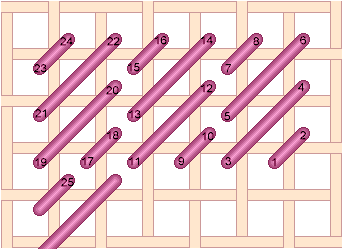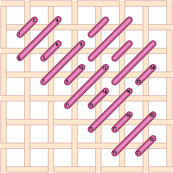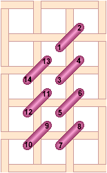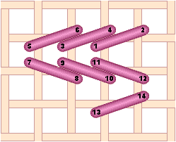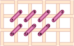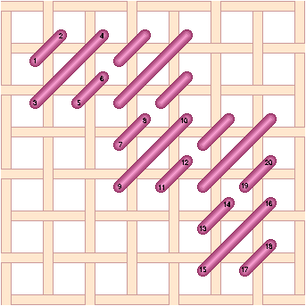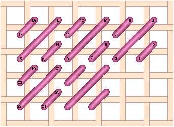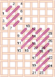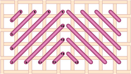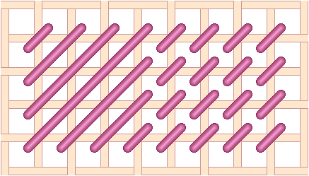 Chequer Stitch is alternating blocks of diagonal Satin Stitch and Tent Stitch. Scotch Stitch worked horizontally. Look at the Mosaic and Cashmere stitches to get an idea of how to work this stitch diagonally or to stitch the condensed version. Mosaic Stitch can be filled in either horizontally... or theMosaic Stitch can be filled in diagonally. Condensed Mosaic Stitch Cashmere Stitch is sort of a squished Scotch Stitch. Cashmere Stitch Condensed Cashmere Stitch Kelim Stitch